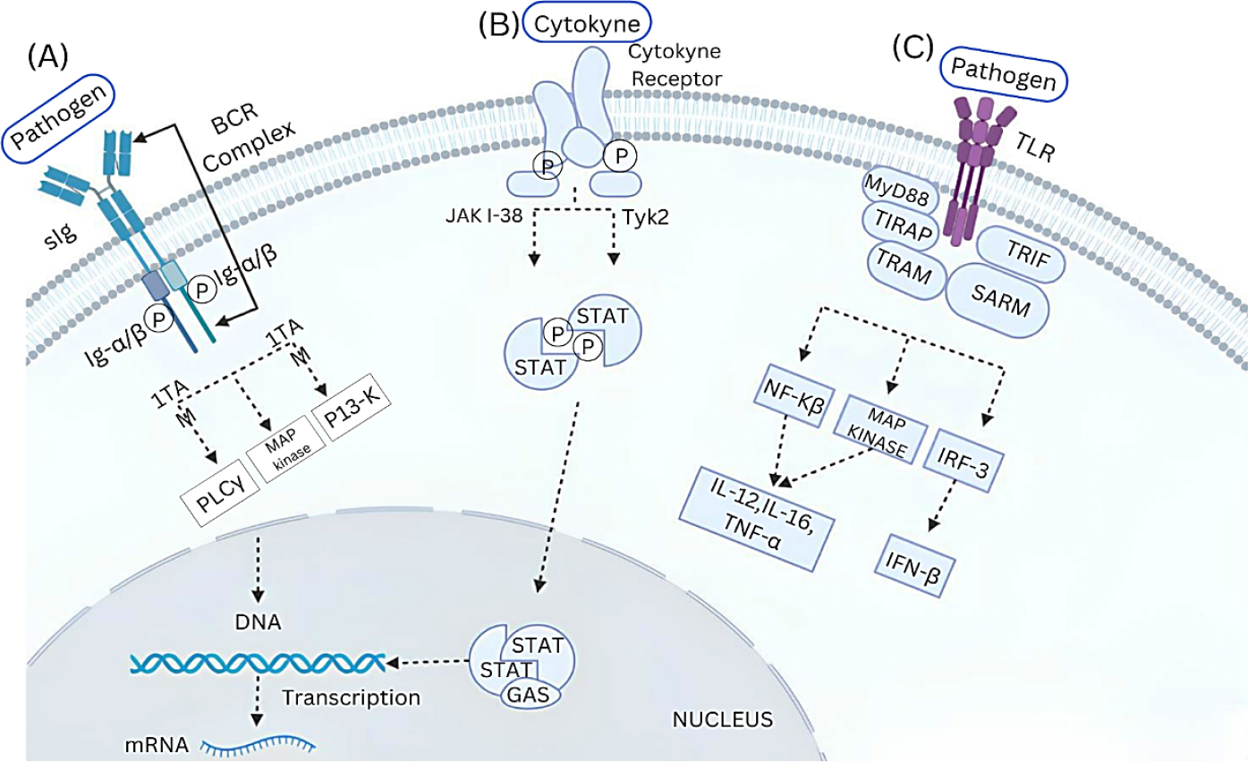 Immune cell signaling. A: Antigen receptor signaling; B: Cytokine receptor signaling; C: TLR-signalling.