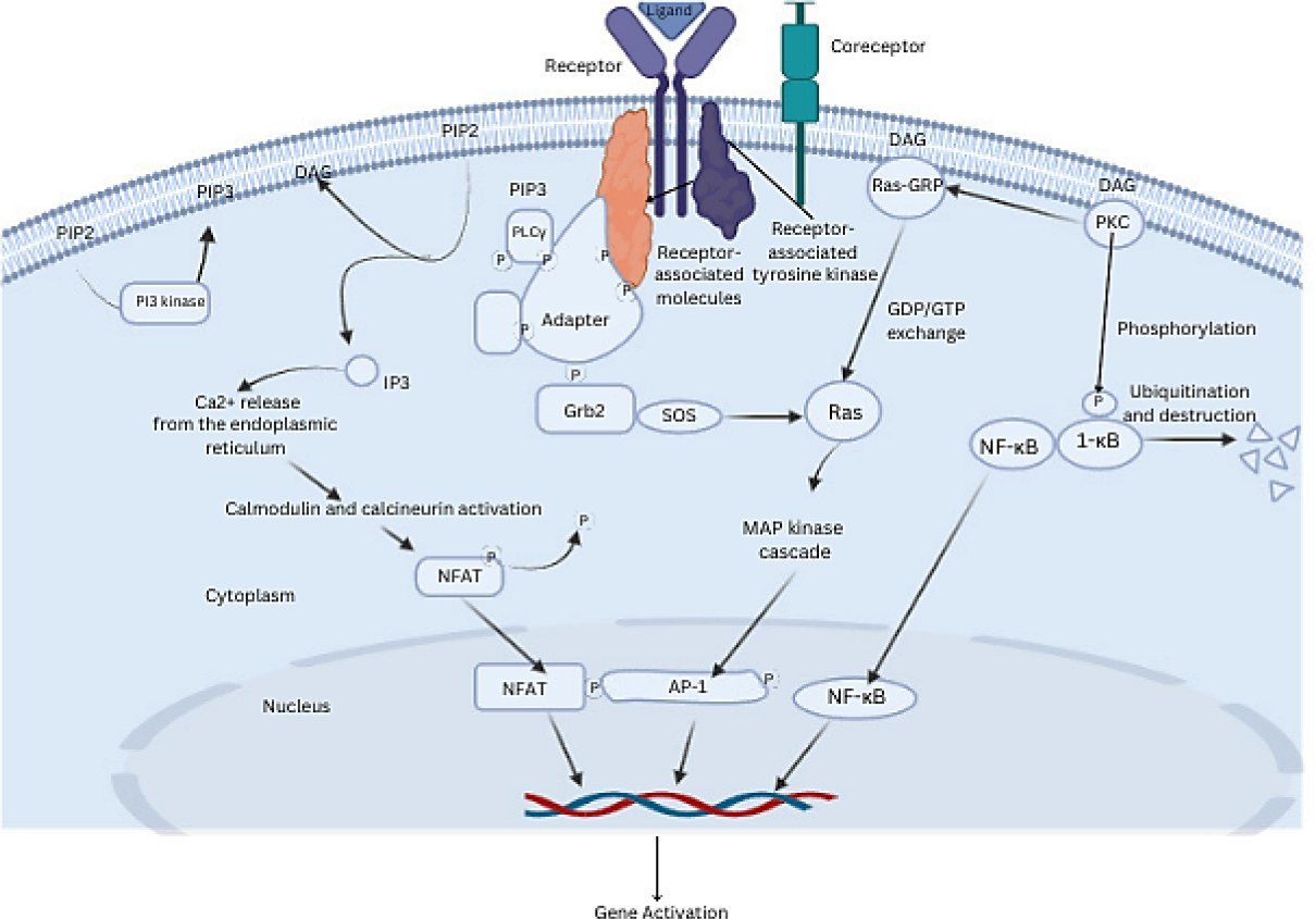 Immune receptor activation activates kinases like ZAP-70 and SYK and phosphatases. Diacylglycerol (DAG), Inositol Trisphosphate (IP3), and Calcium Ions (Ca²⁺) are released throughout this signaling cascade as second messengers. These chemical intermediates boost signaling, activating immune cells (Simet al., 2020).