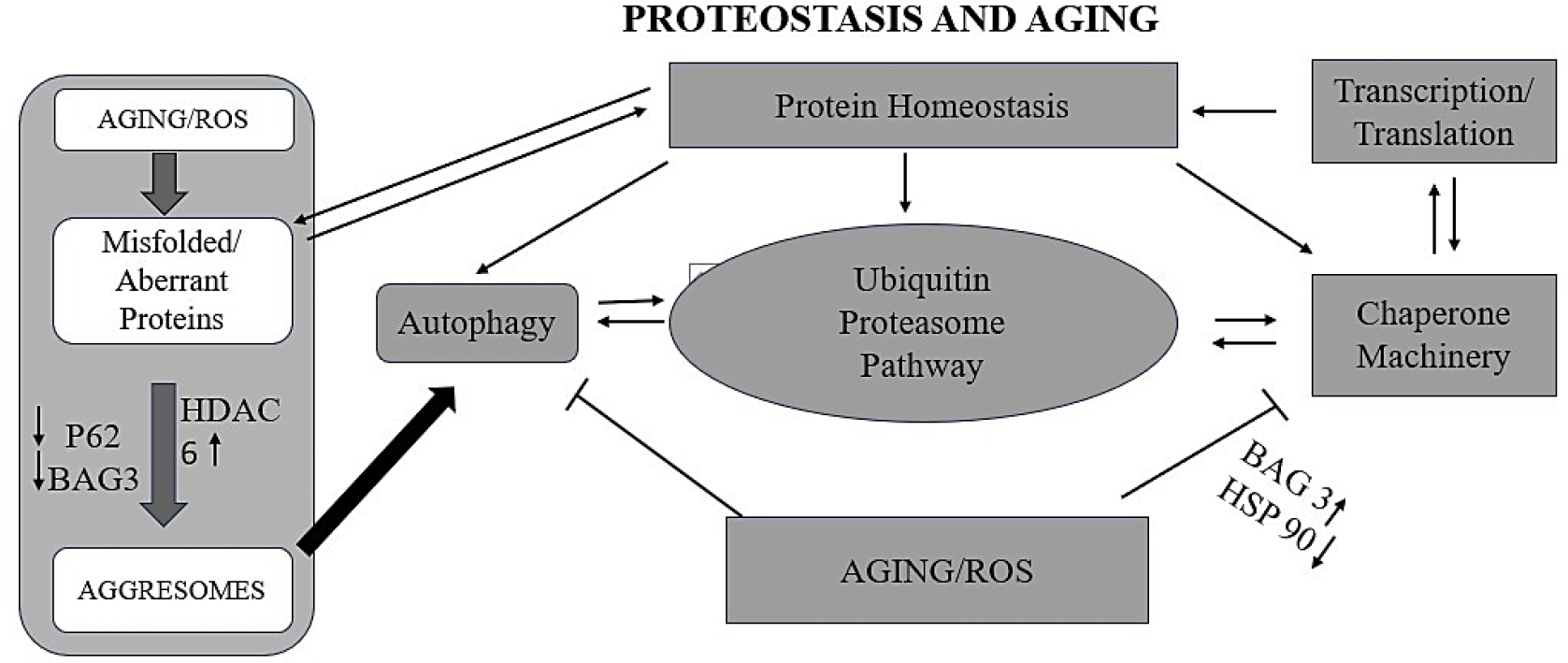 Protein constancy and proteostatistic mechanisms throughout aging are discussed (Figure 4). Abnormal protein ROS buildup, ubiquitin-proteasome pathway failure, chaperone overload, and autophagy degeneration all contribute to protein homeostasis and functional decrease in senior age. Recent research highlights the importance of BAG 3 sesquestosome and HDAC6 in aggresome formation, modulating HDAC 6, histone deacetylase 6 (Gray and Gibbset al., 2022).