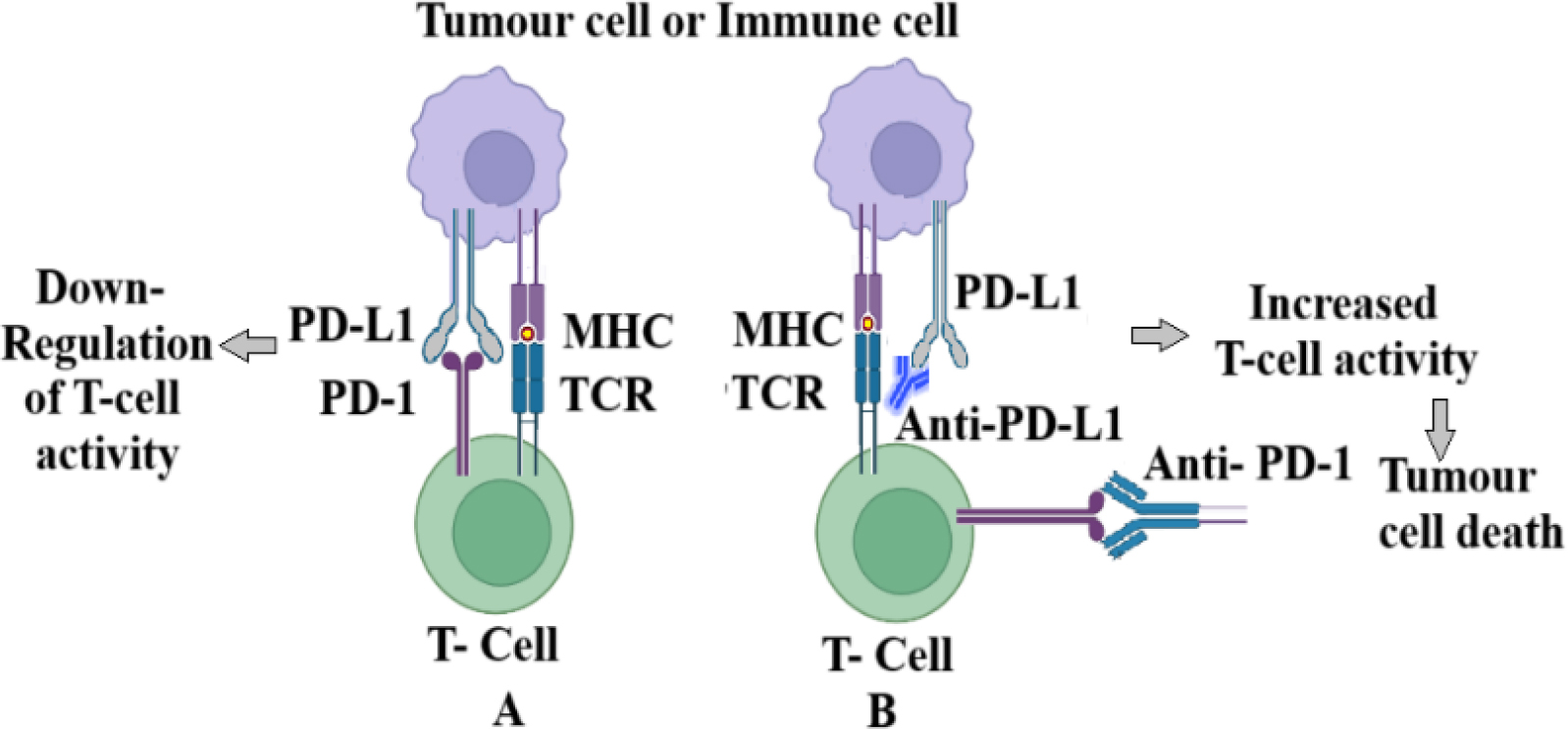 PD1 and anti-PDL1 T-cell activity mechanisms. Activated T-cells in secondary lymphoid tumor tissue (A) increase PD-1 expression. PD-1 binding to its ligands inhibits TCR signaling and controls T-cell activity. (B)Antibody-exhausted T-cells targeting PD-1 or PD-L-1 at the tumor site increase activity and T-cell-mediated tumor cell death.
