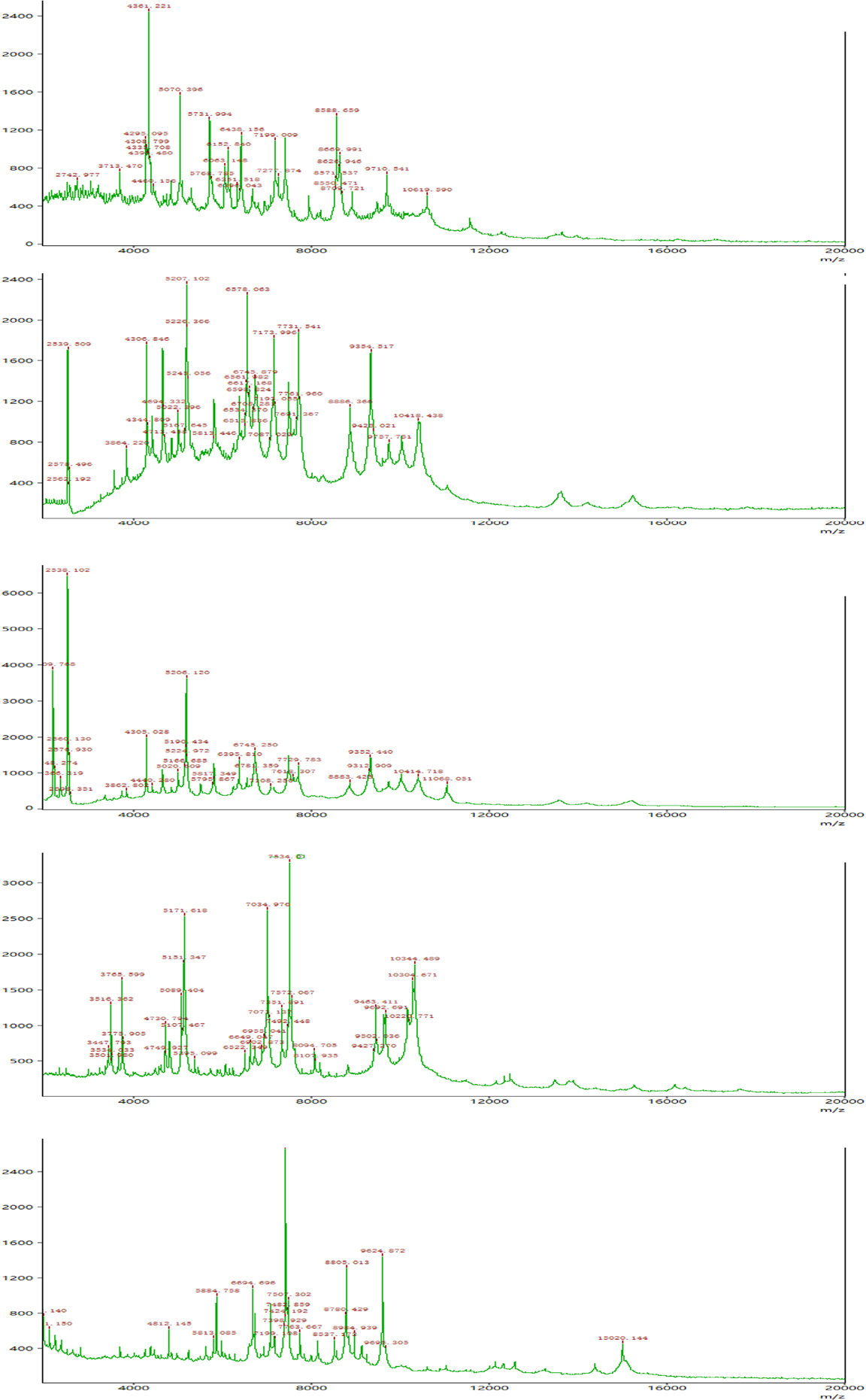 Similarly, Figure 2 shows peak masses of 5 strains of Bacillus and 2 strains of Paenibacillus, which are closely related thus showing the similarity in protein peaks. The peak intensity of Paenibacillus and Bacillus are recorded at m/z of 7150, which are similar. Consequently, these identified peaks are considered specific biomarkers for the recognized genera present in the database. This indicates that these two protein peaks may serve as potential species-specific biomarkers for Bacillus.