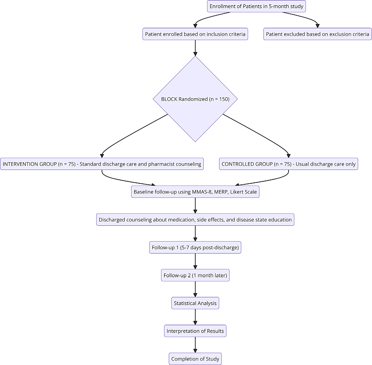A prospective interventional study was conducted at Metas Adventist Hospital, Surat, and Shrimad Rajchandra Hospital, Dharampur, in a span of 6 months to determine the care impact of Clinical pharmacist-led discharge counseling and disease education on patients with chronic illness. Ethical approval was taken (MPC/IHEC/07/2022). Around 150 patients suffering from chronic illness such as IHD, DM, HTN, and stroke were included in this study. Based on the inclusion criteria, participants aged 18 and above, patients diagnosed with chronic illness, those who are willing and available for discharge counseling between 7:30 am and 5:30 pm Monday to Friday ensuring the presence of clinical pharmacists were included. Patients aged below 18, patients who are unwilling and unable to cooperate, those who are transferred to other hospitals, and LAMA were excluded in this study. Pregnant and lactating mothers were also excluded from the study. The ethical clearance was approved from the Human Research Ethics Committee of Maliba Pharmacy College and written informed consent was obtained from each patient. The patients were randomly divided into two groups, the intervention group, and the control group by using the block randomization method. They included a comprehensive case report form to record the patient demographic, medical history, laboratory data, and treatment record. Patients in the intervention group received discharge counseling by the clinical pharmacist and were oriented about the medication and advised about the potential side effects, ADR, drug-drug interactions, and significance of medication adherence. Education leaflets were also provided, which contain disease management, use of medication, and modification of lifestyle to enhance HRQoL. Patients in the control group received standard care without any counseling and education. The patient follow-up procedure was two follow-ups one at 5-7 days and the other one at 1 month post-discharge. The medication adherence was determined by MMAS-8, and validated the scale from which the patient is classified as having high, medium, or low adherence. HRQoL was assessed by using the RAND SF-36 scale, which determined the physical health, mental health, and social health of the patient. The patient’s satisfaction with the care was recorded on 12 items Likert scale. When it comes to medication incidents, a medication incident reporting form was used to record the prescription errors and ADR. Data analysis was done using the descriptive statistic mean and t– test was done between the intervention group and the control group to determine the difference in medication adherence. Paired t-test was used to compare the changes within the intervention group. For the patient satisfaction level, one-tailed paired t-test was used to analyze post counseling. The mean difference of HRQoL was done to classify patient wellbeing. All the analysis were carried out to find out the impact of clinical pharmacist-led discharge counseling (Figure 1).