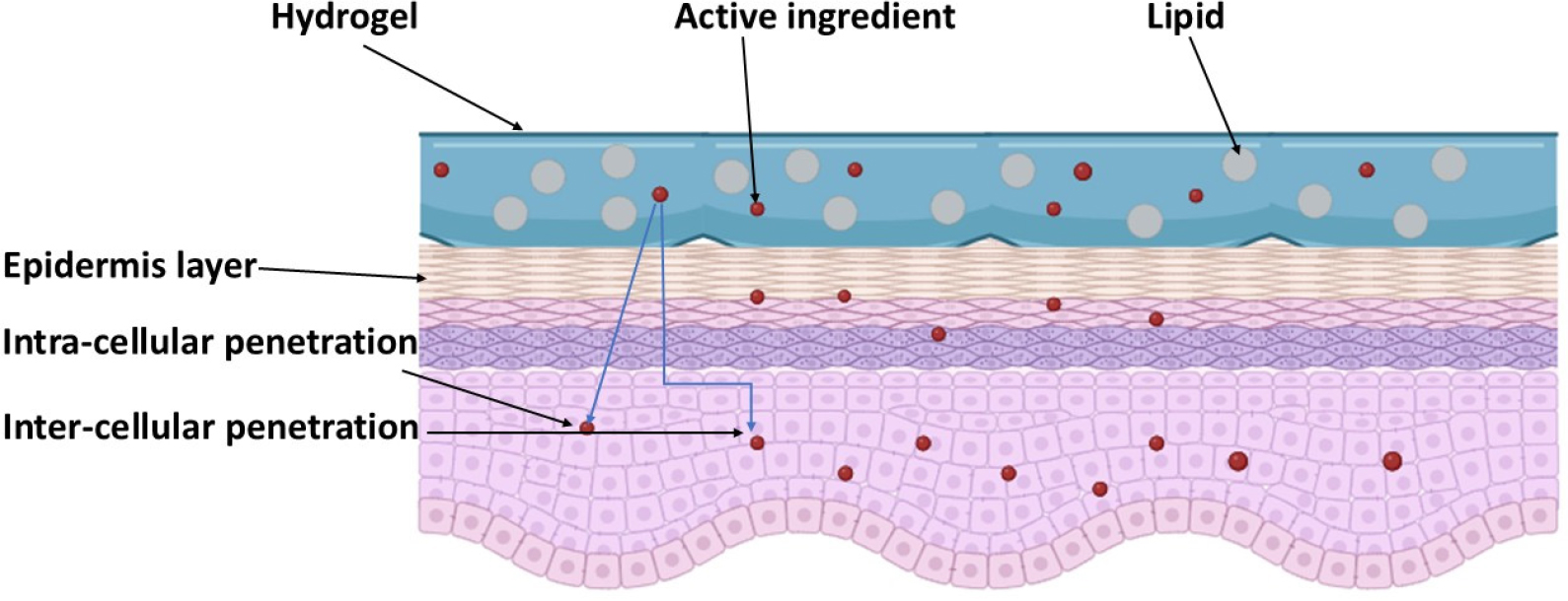 Emulgel improves topical medication absorption through follicular, intercellular, and transcellular pathways (Figure 3). Its dual-control release method uses both emulsion and gel qualities. Blood vessels are dispersed throughout the subcutaneous layer, under the dermis and epidermis. The most popular route is the pilosebaceous route, where penetration occurs through the intercellular matrix. Organic solvents like propylene glycol, DMSO, and surfactants can improve drug penetration. Permeation enhancers improve solubility, partitioning, and fluidization of the crystalline structure. Factors influencing drug absorption include lipid content, skin thickness, sweat gland density, hair follicle density, skin pH, skin temperature, hydration, inflammation, and blood flow. Low lipid content increases percutaneous penetration, while thicker skin layers may result in faster absorption. Increased blood flow promotes faster drug diffusion and systemic uptake (Patelet al., 2021; Khamkatet al., 2024).