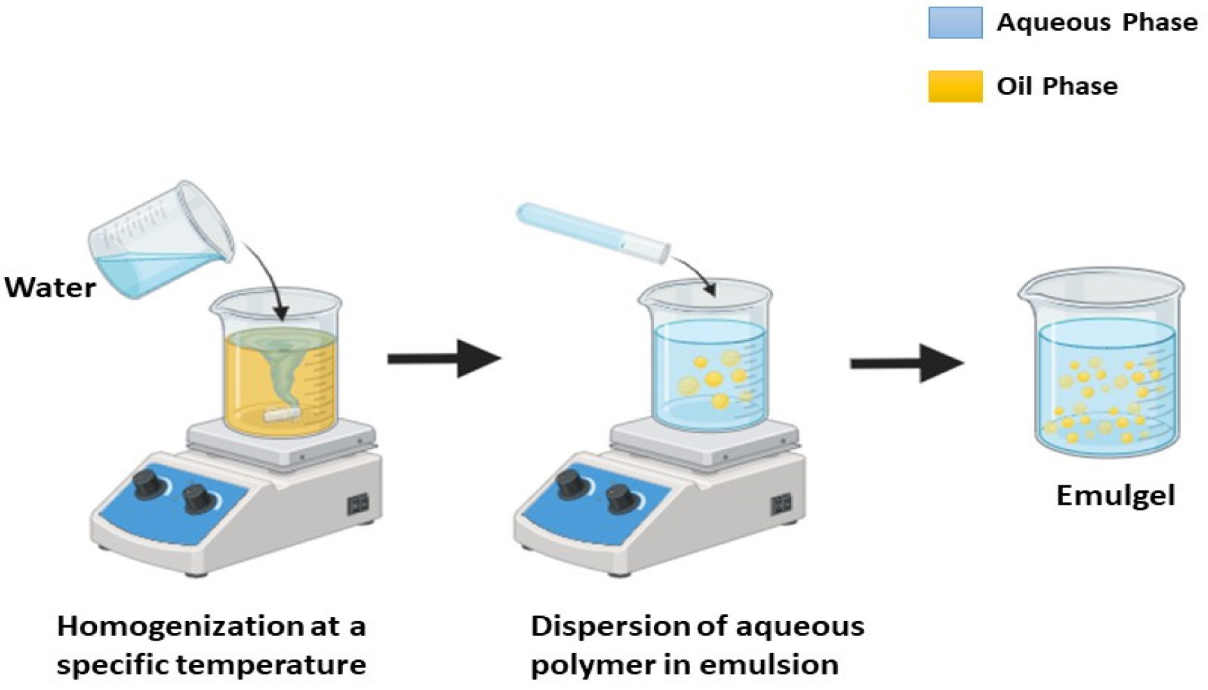The simple method used to prepare emulgel has three main steps. The emulgel is created by combining an emulsion into the gel base after the first two phases of preparing the emulsion and gel base independently (Figure 4). Hydrophilic emulsifying agent is first dissolved in distilled water to create the aqueous phase. Similarly, lipophilic emulsifying agent is dissolved in liquid paraffin to create the oil phase. After being heated independently to 70° to 80°, the oil and aqueous phases are combined while being constantly stirred to create an emulsion. Gelling agent is dissolved at room temperature in distilled water to create the gel phase. Ultimately, an emulgel is created by gently swirling the gel and emulsion phases together in a 1:1 ratio (Figure 5).