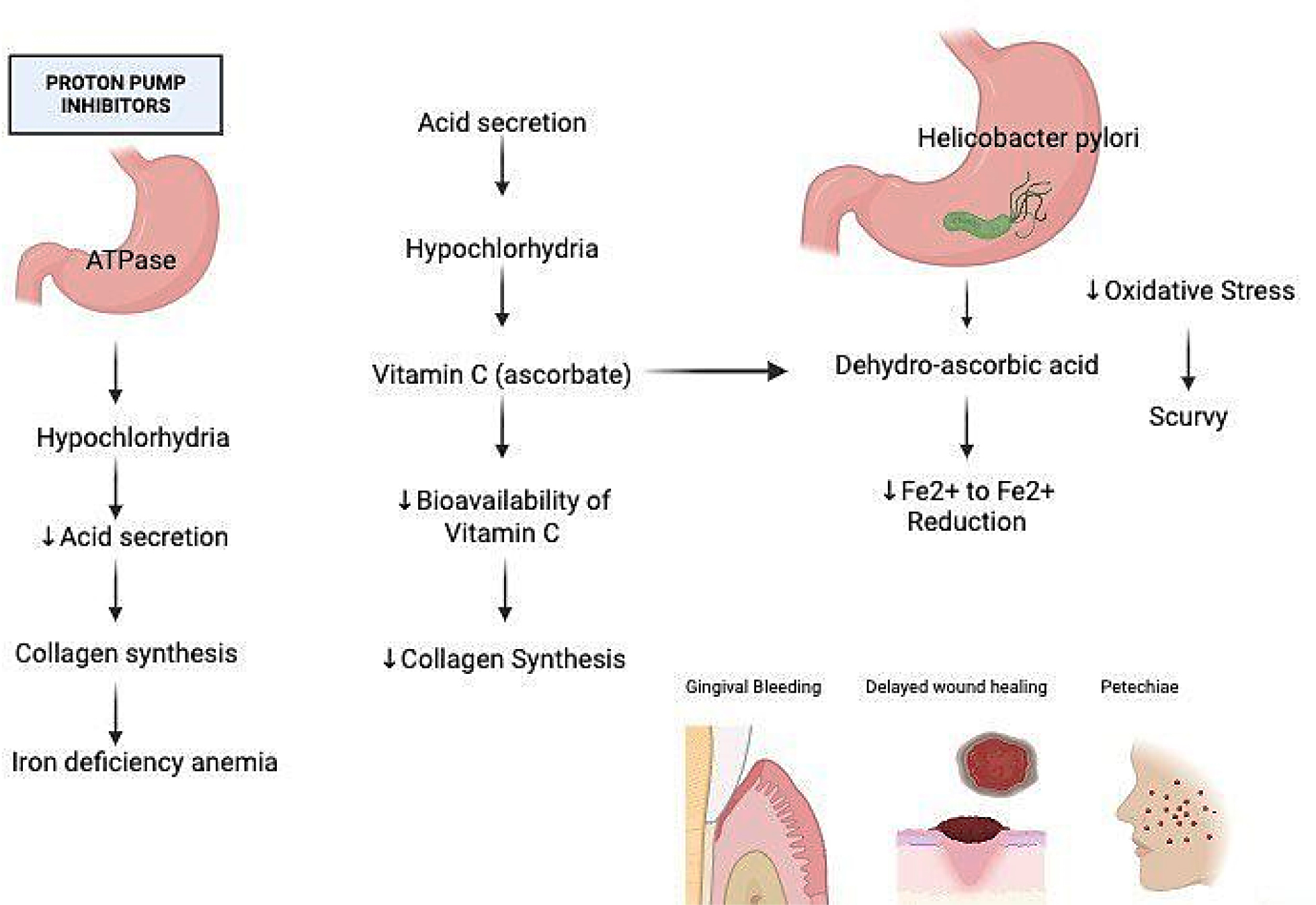 When the pH level of the stomach increases and helicobacter pylori infection occurs a molecular cascade begins to occur (Freedberget al., 2014a). H. Pylori caused gastritis causes parietal cells to function less effectively, increases pH and accelerates the oxidation of ascorbate both in and out of cells. This occurs because bacteria absorb ascorbate and produce oxidative stress (�dum and Andersen, 1995). Research indicates that individuals with H. pylori have significantly lower stomach levels of ascorbate, significantly higher levels of DHAA and don’t completely recover after a dose of Vitamin C (�dum and Andersen, 1995). This is consistent with the notion the hypochlorhydria and microbial stress interact to exacerbate. Fewer Vitamin C prevents the synthesis of collagen. This makes blood vessel weak which manifests as gingival bleeding, petechiae and delayed wound healing- scurvy signs. Furthermore, vitamin C’s capacity to reduce Fe³⁺ to Fe²⁺ is compromised which may result in iron deficiency anemia in individuals who have been on PPI for years (Figure 1) (O’Connor et al., 1989b).