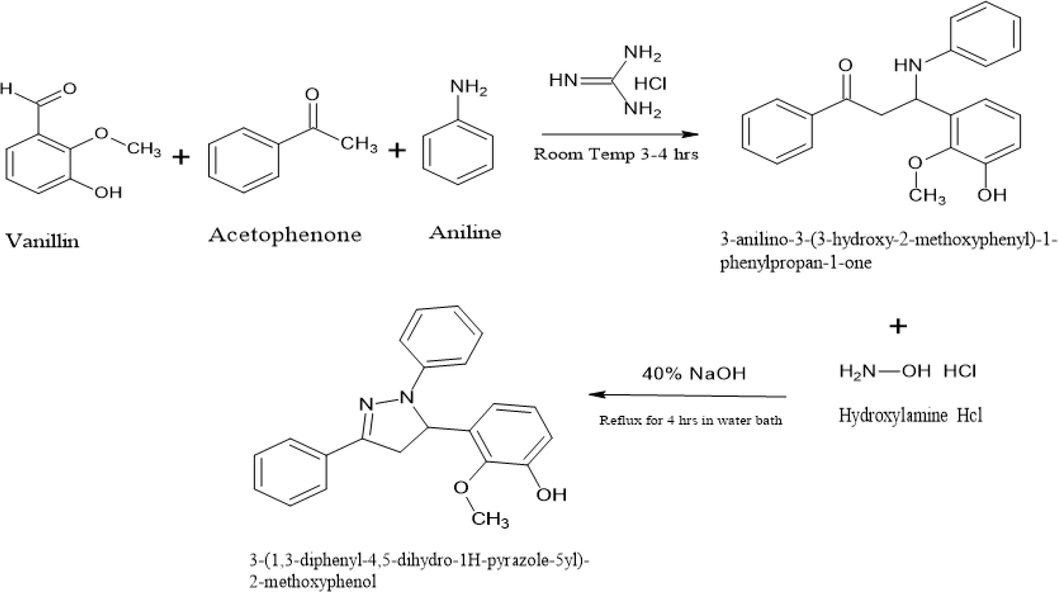 Analytical grade chemicals (HPLC grade): Vanillin, Acetophenone, Aniline, Guanidine Hydrochloride, Acetone, Ethanol, Hydroxylamine Hydrochloride, 40% NaOH Solution from India Mart and Yarrow Chem Products were purchased and used without any further purification.