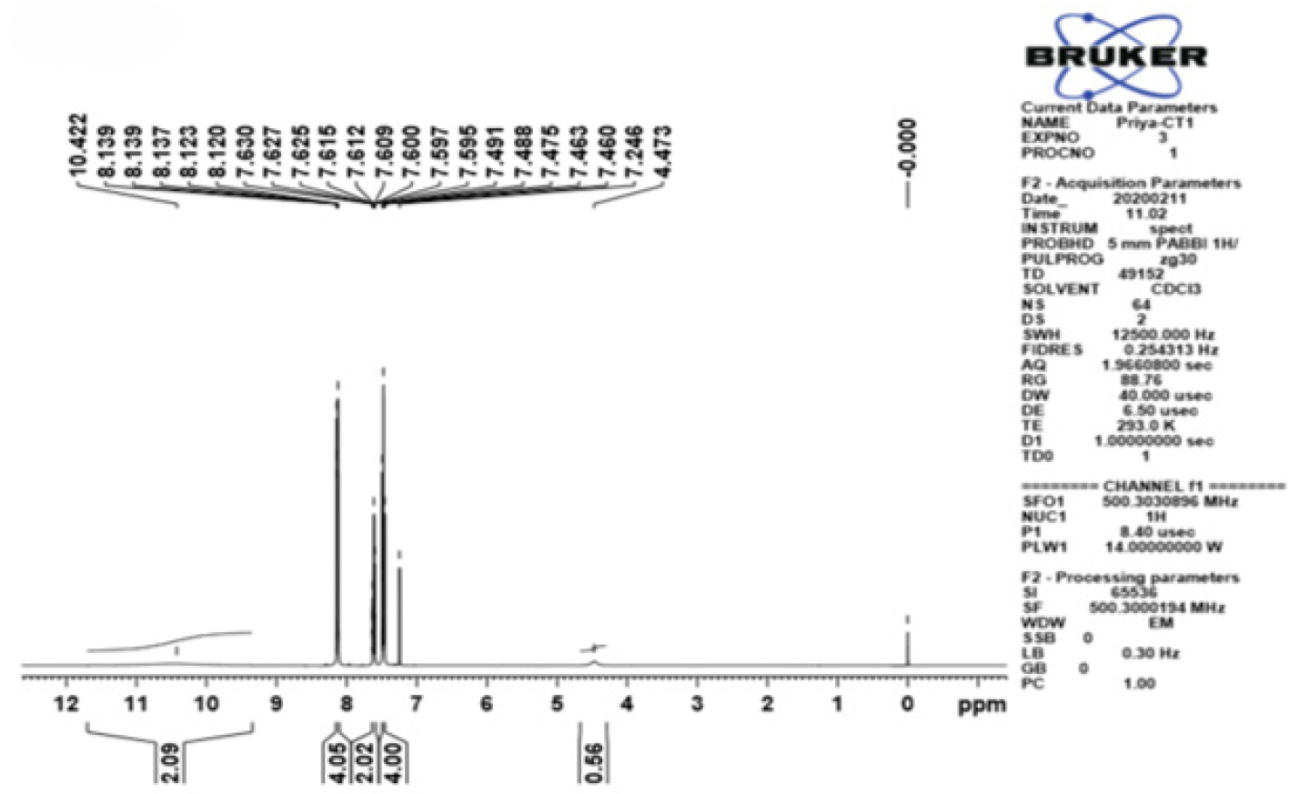 1H NMR spectroscopy of the synthesized compound illustrating the distribution of protons and validating hydrogen atom positions.