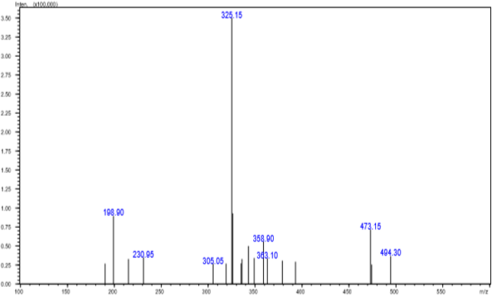 Mass spectroscopy of the synthesized compound displaying the molecular ion peak characteristic fragmentation pattern, confirming molecular weight.
