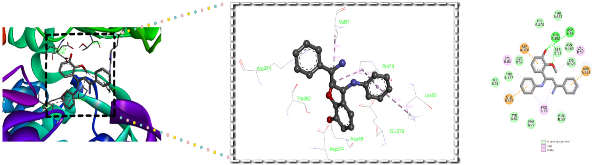 (A) The Binding interactions of the synthesized compound with Topoisomerase II enzyme, highlighting hydrogen bonding, π-π stacking, and hydrophobic interaction at the active site.