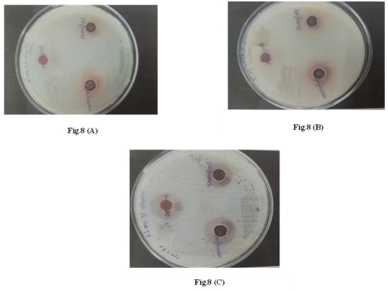 (A) Zone of inhibition against E. coli showing effective antibacterial activity of the compound (B) Zone of inhibition against P. aeruginosa demonstrating moderate antibacterial susceptibility (C) Zone of inhibition against S. aureus confirming broad spectrum anti-bacterial efficacy