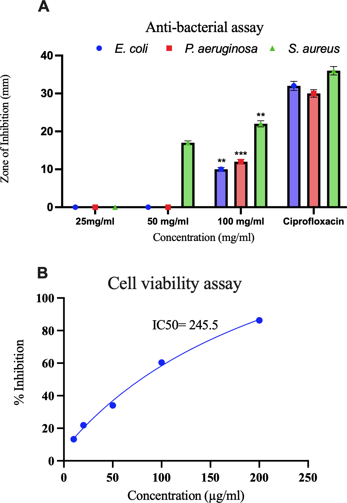 (A) Anti-bacterial activity of the test agent against E. coli, P. aeruginosa, and S. aureus showing concentration-dependent zones of inhibition compared with ciprofloxacin (positive control). Data are presented as Mean±SEM (n=3); statistical significance vs. control was determined by one-way ANOVA followed by post hoc analysis (**p<0.01, ***p<0.001). (B) Cell viability assay showing dose-dependent inhibition with IC₅₀=245.5 µg/mL.