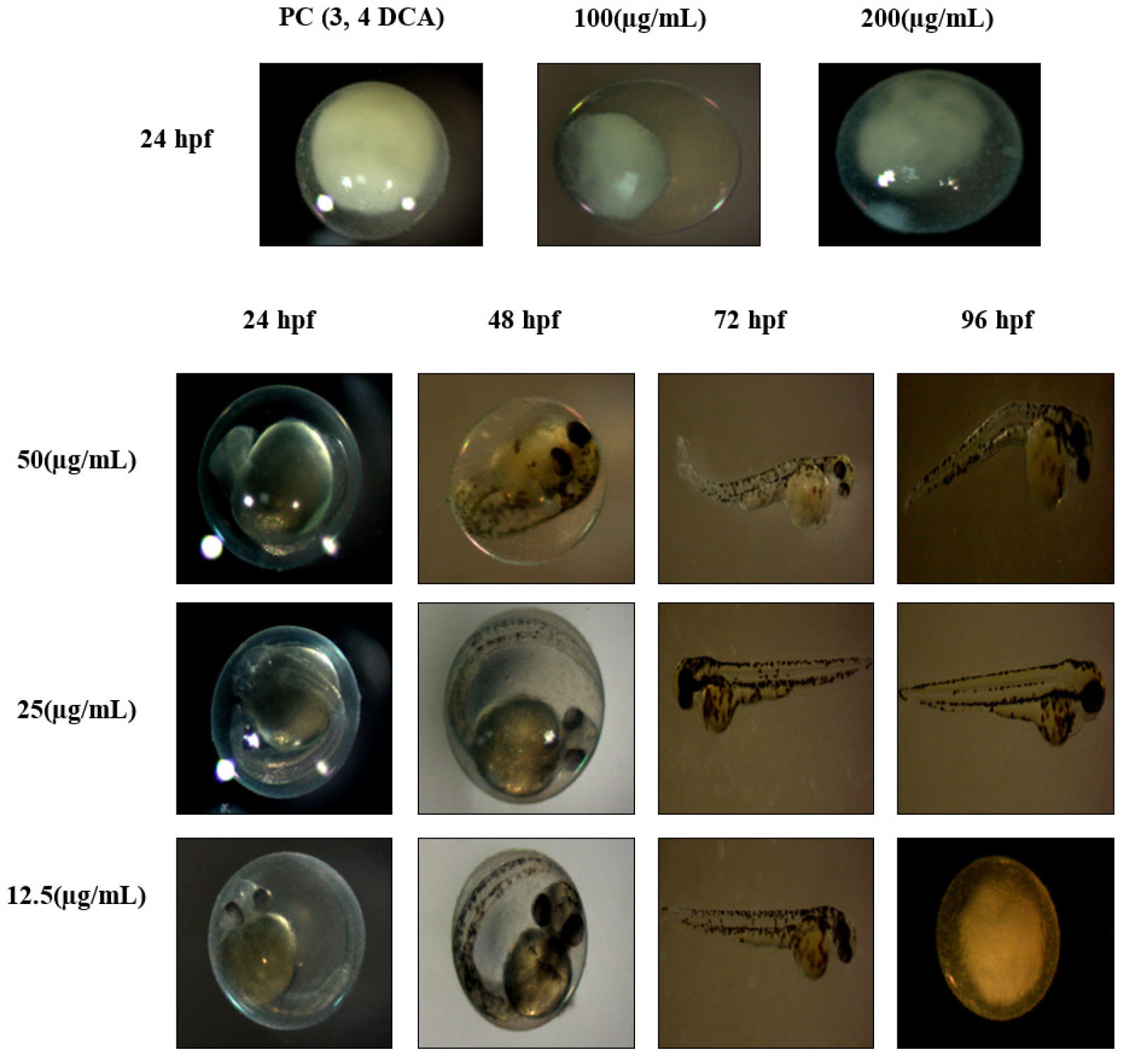Representative image of zebrafish embryos exposed to various concentrations of compound (12.5 – 200 µg/mL) compared with positive control (3,4-DCA), obsereved at 24,48, 72 and 96 hpf. Morphological changes including developmental delay, edema, and lethality were recorded at higher concentration.